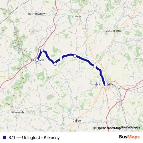 The first stop of the 871 bus route is Urlingford and the last stop is Kilkenny Castle. 871 (Urlingford - Kilkenny) is operational during everyday.