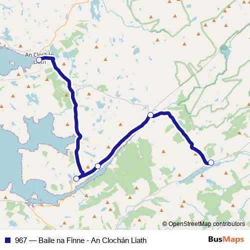 The first stop of the 967 bus route is An Clochán Liath and the last stop is Baile na Finne. 967 (Baile na Finne - An Clochán Liath) is operational during on weekdays.