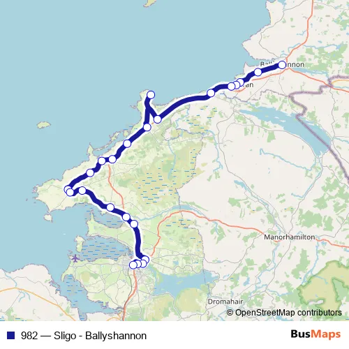 The first stop of the 982 bus route is Ballyshannon and the last stop is Sligo Bus Station. 982 (Sligo - Ballyshannon) is operational during everyday.