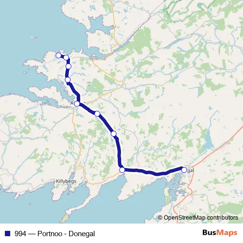 The first stop of the 994 bus route is Portnoo and the last stop is Donegal. 994 (Portnoo - Donegal) is operational during on weekdays.