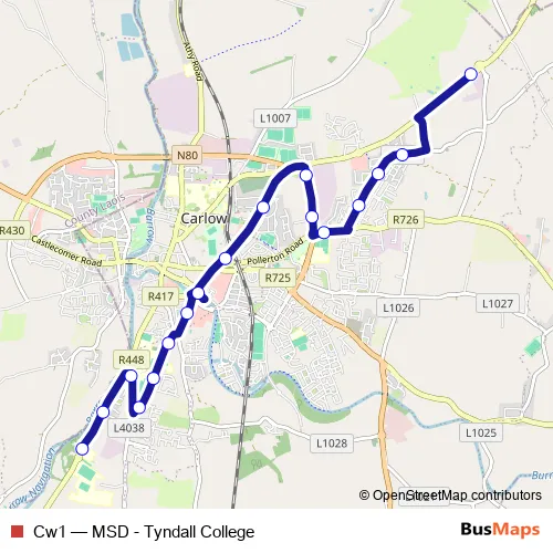 The first stop of the Cw1 bus route is MSD Carlow and the last stop is Carlow Institute. Cw1 (MSD - Tyndall College) is operational during everyday.