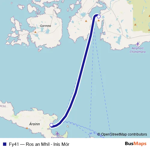The first stop of the Fy41 ferry route is Inis Mór and the last stop is Ros an Mhíl. Fy41 (Ros an Mhíl - Inis Mór) is operational during everyday.
