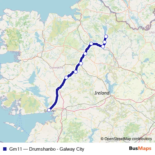 The first stop of the Gm11 bus route is Eyre Square North (Stop No 2) and the last stop is Drumshanbo. Gm11 (Drumshanbo - Galway City) is operational during everyday.