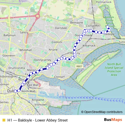 The first stop of the H1 bus route is Abbey Street Lower and the last stop is Baldoyle Estuary. H1 (Baldoyle - Lower Abbey Street) is operational during everyday.