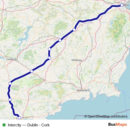 The first stop of the Intercity rail route is Cork (Kent) and the last stop is Dublin Heuston. Intercity (Dublin - Cork) is operational during everyday.
