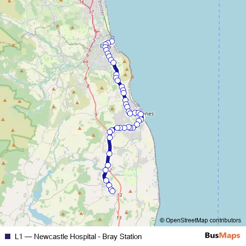 The first stop of the L1 bus route is Bray Station and the last stop is Newcastle Hospital. L1 (Newcastle Hospital - Bray Station) is operational during everyday.
