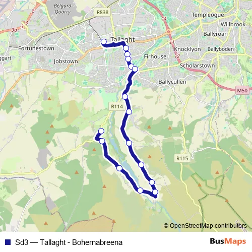 The first stop of the Sd3 bus route is Tallaght Luas and the last stop is Ballinascorney. Sd3 (Tallaght - Bohernabreena) is operational during everyday.