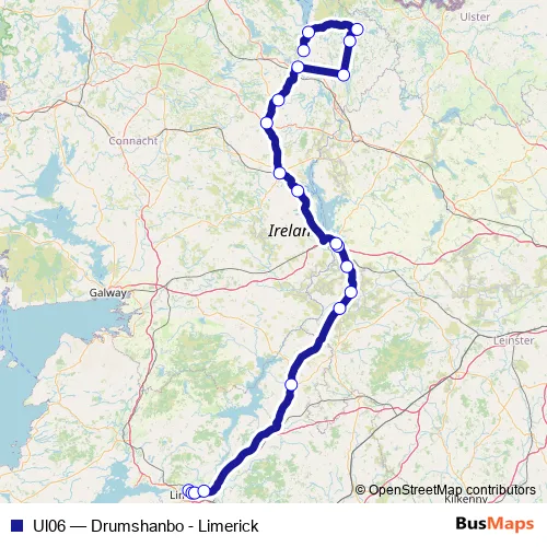 The first stop of the Ul06 bus route is Limerick Arthur's Quay and the last stop is Leitrim. Ul06 (Drumshanbo - Limerick) is operational during everyday.