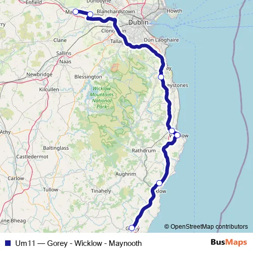 The first stop of the Um11 bus route is Gorey Main Street and the last stop is Maynooth University Library. Um11 (Gorey - Wicklow - Maynooth) is operational during on weekdays.