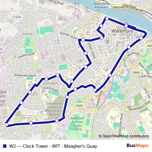 The first stop of the W2 bus route is The Clock Tower and the last stop is The Clock Tower. W2 (Clock Tower - WIT - Meagher's Quay) is operational during everyday.