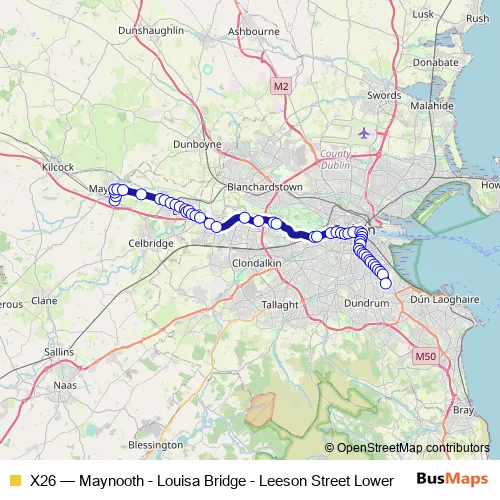 Click here to view the nearest X26 - Maynooth - Louisa Bridge - Leeson Street Lower bus stop.