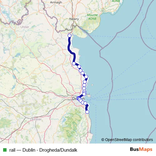 The first stop of the rail rail route is Drogheda (Macbride) and the last stop is Grand Canal Dock. rail (Dublin - Drogheda/Dundalk) is operational during everyday.