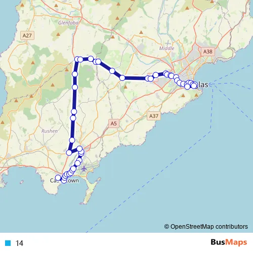 The first stop of the 14 bus route is Castle Rushen High School and the last stop is Douglas, Banks Circus. 14 is operational during on weekdays.