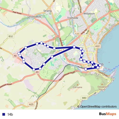 The first stop of the 14b bus route is Douglas, Banks Circus and the last stop is Douglas, Banks Circus. 14b is operational during on weekdays.