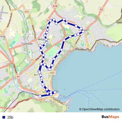 The first stop of the 25b bus route is Douglas, Banks Circus and the last stop is Douglas, Lord Street. 25b is operational during on weekdays.