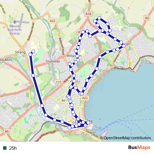 The first stop of the 25h bus route is Douglas, Banks Circus and the last stop is Nobles Hospital main entrance, towards Douglas. 25h is operational during everyday.