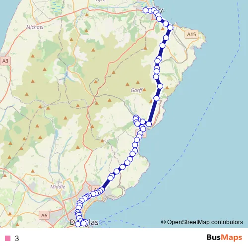 The first stop of the 3 bus route is Ramsey Bus Station and the last stop is Douglas, Banks Circus. 3 is operational during everyday.