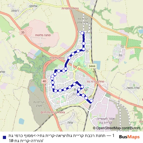 The first stop of the 1 bus route is Kiryat Gat Rail Station/Exit and the last stop is Carmei Gat/Dropoff. 1 (תחנת רכבת קריית גת/יציאה-קרית גת<->מסוף כרמי גת/הורדה-קרית גת-1#) is operational during everyday.