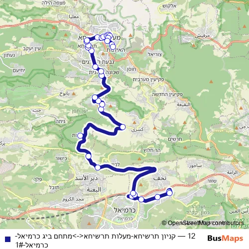 The first stop of the 12 bus route is Big Center Karmiel and the last stop is Hama'apilim/Kalanit. 12 (קניון תרשיחא-מעלות תרשיחא<->מתחם ביג כרמיאל-כרמיאל-1#) is operational during everyday.