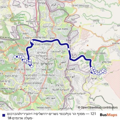 The first stop of the 121 bus route is Har Nof Terminal/Kanfei Nesharim and the last stop is Ha'Irit/Hakarkum. 121 (מסוף הר נוף/כנפי נשרים-ירושלים<->העירית/הכרכום-מעלה אדומים-1#) is operational during everyday.
