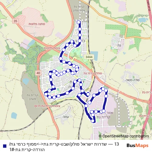 The first stop of the 13 bus route is Carmei Gat/Pickup and the last stop is Pollack/Tevet. 13 (שדרות ישראל פולק/שבט-קרית גת<->מסוף כרמי גת/הורדה-קרית גת-1#) is operational during everyday.