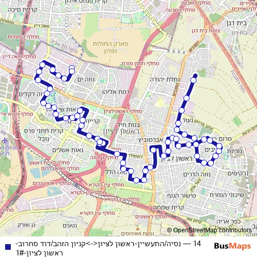 The first stop of the 14 bus route is מסוף קניון הזהב and the last stop is Nesiya/Hata'asiyan. 14 (נסיה/התעשיין-ראשון לציון<->קניון הזהב/דוד סחרוב-ראשון לציון-1#) is operational during everyday.