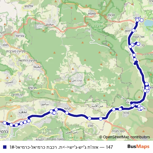 The first stop of the 147 bus route is אזה'ת ג'יש and the last stop is Karmiel Train Station. 147 (אזה'ת ג'יש-ג'יש<->ת. רכבת כרמיאל-כרמיאל-1#) is operational during everyday.