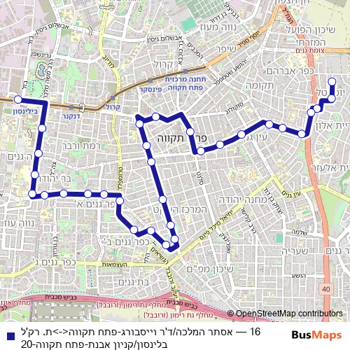 The first stop of the 16 bus route is אסתר המלכה/ד'ר וייסבורג and the last stop is ת. רק'ל בלינסון/קניון אבנת. 16 (אסתר המלכה/ד'ר וייסבורג-פתח תקווה<->ת. רק'ל בלינסון/קניון אבנת-פתח תקווה-20) is operational during everyday.
