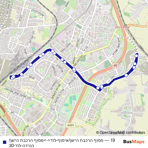 The first stop of the 19 bus route is Old Train Terminal/Boarding and the last stop is Old Train Terminal/Alight. 19 (מסוף הרכבת הישן/איסוף-לוד<->מסוף הרכבת הישן/הורדה-לוד-30) is operational during everyday.