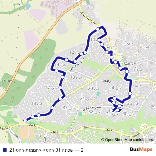 The first stop of the 2 bus route is Quarter 31 and the last stop is Hamamot. 2 (שכונה 31-רהט<->חממות-רהט-21) is operational during everyday.