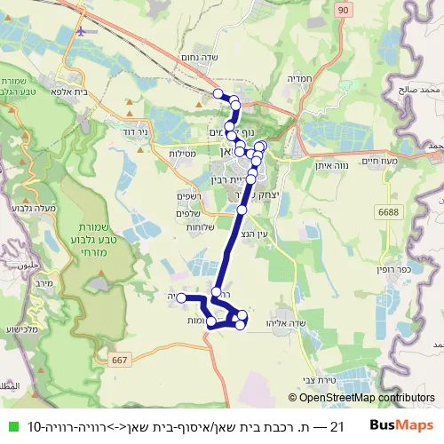 The first stop of the 21 bus route is Bet She'an Railway Station/Boarding and the last stop is Revaya. 21 (ת. רכבת בית שאן/איסוף-בית שאן<->רוויה-רוויה-10) is operational during everyday.