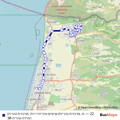 The first stop of the 22 bus route is Nahariya Central Station/Platforms and the last stop is Nahariya Central Station/Alight. 22 (ת. מרכזית נהריה/רציפים-נהריה<->ת. מרכזית נהריה/הורדה-נהריה-3#) is operational during everyday.