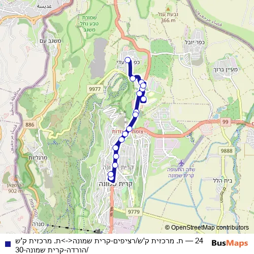 The first stop of the 24 bus route is ת. מרכזית ק'ש/רציפים and the last stop is ת. מרכזית ק'ש/הורדה. 24 (ת. מרכזית ק'ש/רציפים-קרית שמונה<->ת. מרכזית ק'ש/הורדה-קרית שמונה-30) is operational during everyday.