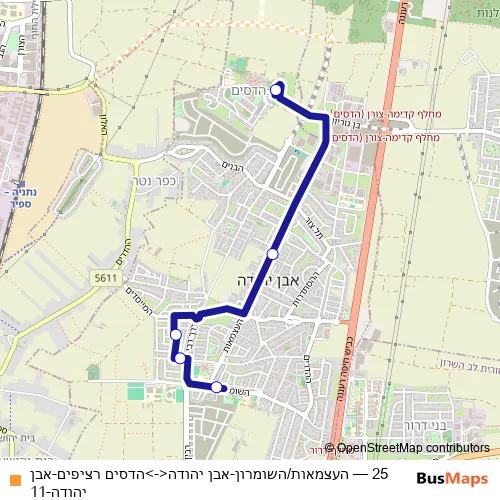 The first stop of the 25 bus route is Ha'Atsma'ut/Hashomron and the last stop is Hadasim - Platforms. 25 (העצמאות/השומרון-אבן יהודה<->הדסים רציפים-אבן יהודה-11) is operational during everyday.
