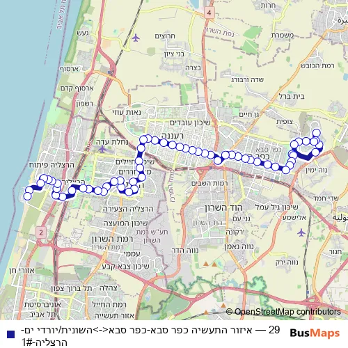 The first stop of the 29 bus route is Hashunit/Yorde Yam and the last stop is Kfar Sava Industrial Zone. 29 (איזור התעשיה כפר סבא-כפר סבא<->השונית/יורדי ים-הרצליה-1#) is operational during on weekends.