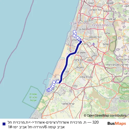 The first stop of the 320 bus route is Ashdod Central Station/Platforms and the last stop is Tel Aviv Central Station 6th Floor/Alight. 320 (ת. מרכזית אשדוד/רציפים-אשדוד<->ת.מרכזית תל אביב קומה 6/הורדה-תל אביב יפו-1#) is operational during everyday.