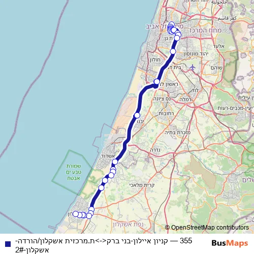 The first stop of the 355 bus route is Ayalon Mall and the last stop is Ashkelon Central Station/Alight. 355 (קניון איילון-בני ברק<->ת.מרכזית אשקלון/הורדה-אשקלון-2#) is operational during everyday.