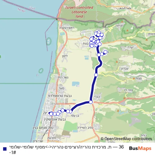 The first stop of the 36 bus route is Shlomi Terminal and the last stop is Nahariya Central Station/Alight. 36 (ת. מרכזית נהריה/רציפים-נהריה<->מסוף שלומי-שלומי-1#) is operational during everyday.