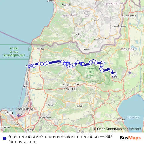 The first stop of the 367 bus route is Nahariya Central Station/Platforms and the last stop is Safed Central Station/Alight. 367 (ת. מרכזית נהריה/רציפים-נהריה<->ת. מרכזית צפת/הורדה-צפת-1#) is operational during everyday.