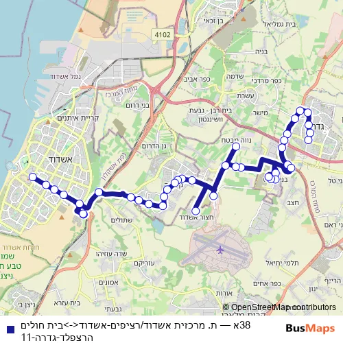 The first stop of the 38א bus route is Pines/Ben Gurion Boulevard and the last stop is Ashdod Central Station. 38א (ת. מרכזית אשדוד/רציפים-אשדוד<->בית חולים הרצפלד-גדרה-11) is operational during on weekends.