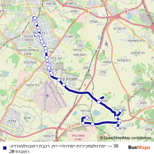 The first stop of the 38 bus route is Yesodot/Office and the last stop is Rehovot Train Sttn/Drop-Off. 38 (יסודות/מזכירות-יסודות<->ת. רכבת רחובות/הורדה-רחובות-2#) is operational during everyday.