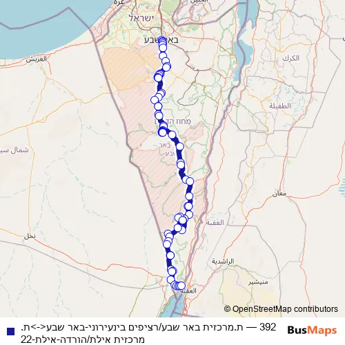 The first stop of the 392 bus route is Be'er Sheva Central Station/Interurban Platforms and the last stop is Eilat Central Station/Alight. 392 (ת.מרכזית באר שבע/רציפים בינעירוני-באר שבע<->ת. מרכזית אילת/הורדה-אילת-22) is operational during everyday.