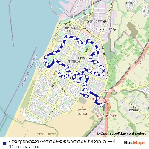 The first stop of the 4 bus route is Ashdod Central Station/Platforms and the last stop is Train/BIG Term - Drop. 4 (ת. מרכזית אשדוד/רציפים-אשדוד<->רכבת/מסוף ביג - הורדה-אשדוד-1#) is operational during everyday.