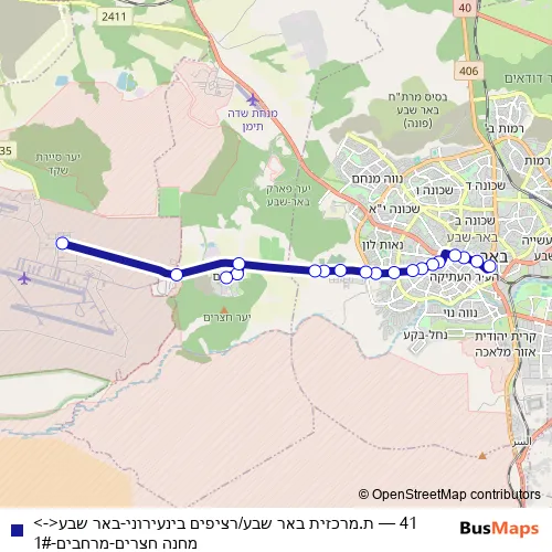 The first stop of the 41 bus route is Be'er Sheva Central Station/Interurban Platforms and the last stop is Hatserim Camp. 41 (ת.מרכזית באר שבע/רציפים בינעירוני-באר שבע<->מחנה חצרים-מרחבים-1#) is operational during everyday.