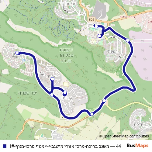 The first stop of the 44 bus route is Manof Center and the last stop is Misgav Pool. 44 (משגב בריכה-מרכז אזורי מישגב<->מנוף מרכז-מנוף-1#) is operational during everyday.