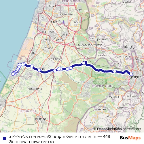 The first stop of the 448 bus route is Jerusalem Central Bus Station 3rd Floor/Platforms and the last stop is Ashdod Central Station. 448 (ת. מרכזית ירושלים קומה 3/רציפים-ירושלים<->ת. מרכזית אשדוד-אשדוד-2#) is operational during everyday.