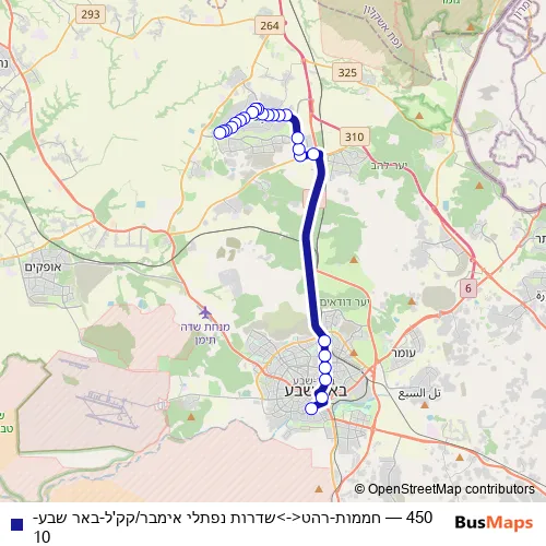 The first stop of the 450 bus route is Naftali Herz Imber Boulevard/Kfar Darom and the last stop is Hamamot. 450 (חממות-רהט<->שדרות נפתלי אימבר/קק'ל-באר שבע-10) is operational during everyday.