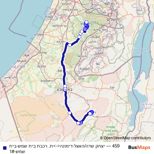 The first stop of the 459 bus route is Yitshak Sade/Ha'Etzel and the last stop is Bet Shemesh Railway Station. 459 (יצחק שדה/האצל-דימונה<->ת. רכבת בית שמש-בית שמש-1#) is operational during everyday.