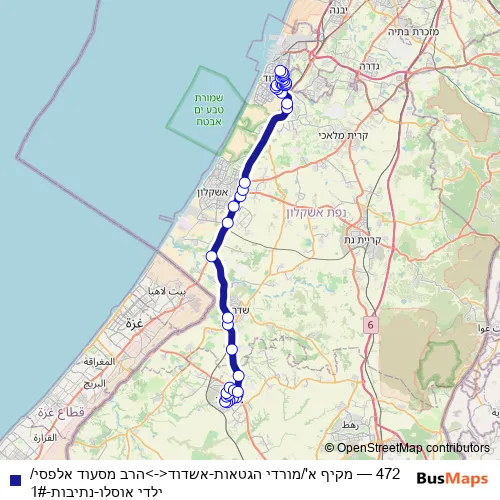 The first stop of the 472 bus route is Alfasi/Yalde Oslo and the last stop is Comprehensive A/Morde Hageta'ot. 472 (מקיף א'/מורדי הגטאות-אשדוד<->הרב מסעוד אלפסי/ילדי אוסלו-נתיבות-1#) is operational during everyday.