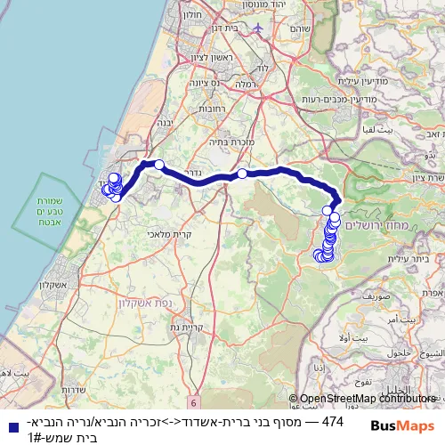 The first stop of the 474 bus route is Zekharya Hanavi/Haamora'im Blvd and the last stop is Bne Brit/Morde Hageta'ot. 474 (מסוף בני ברית-אשדוד<->זכריה הנביא/נריה הנביא-בית שמש-1#) is operational during everyday.